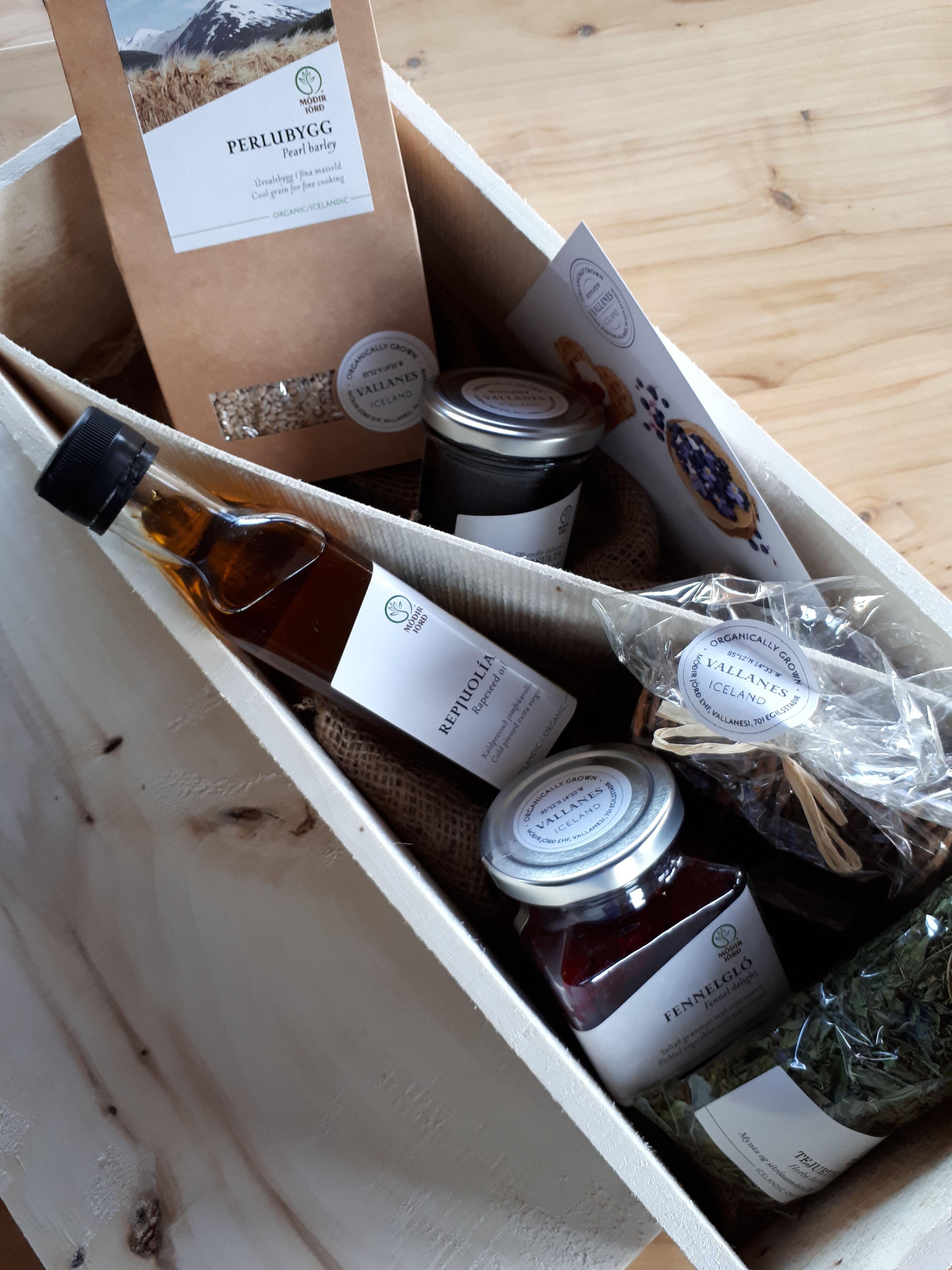 Sælkeravörurnar okkar eiga uppruna sinn í lífrænni ræktun í Vallanesi og henta vel í veisluborðið eða í gjafakörfuna. Við útbúum gjafir eftir óskum, t.d.gjafakassa úr íslenskri ösp frá Vallanesi. Kassinn er hannaður af Thomasi Rappaport og er fáanlegur í tveimur stærðum sem rúma 6 – 10 Móður Jarðar vörur. Lokið má nota sem skurðarbretti eða til að bera fram mat.
