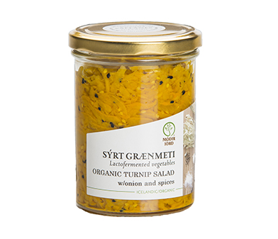 Turnips are Iceland’s main staple food and is an important ingredient in various classic dishes in the Nordic cuisine. Classic, Icelandic yellow turnips are a great winter vegetable for us and they contain more vitamin C than oranges ! For this product we use a more modern approach to fermentation as we use citrus which gives it a pungent flavor and at the same time reduces the level of salt somewhat. This colorful, natural probiotic is suitable as a refreshing accompaniment or topping with different foods. Try it on salads or with sushi. This product has not been sterilized or pasteurized and should be stored in a refrigerator at 0-4°C.