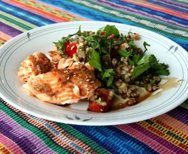 Ég bar fram lax með þessu salati en mér finnst lax og bankabygg smakkast mjög vel saman.  Laxinn mætti bara salta og pipra og hafa það einfalt.