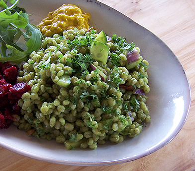 Skerið gúrkuna og rauðlaukinn í fína teninga. Setjið steinseljuna, spínatið, olíuna, eplasafann, sinnepið, dálítið af salti og pipar í matvinnsluvél og maukið. Blandið að því loknu öllu saman og smakkið til með salti og pipar.